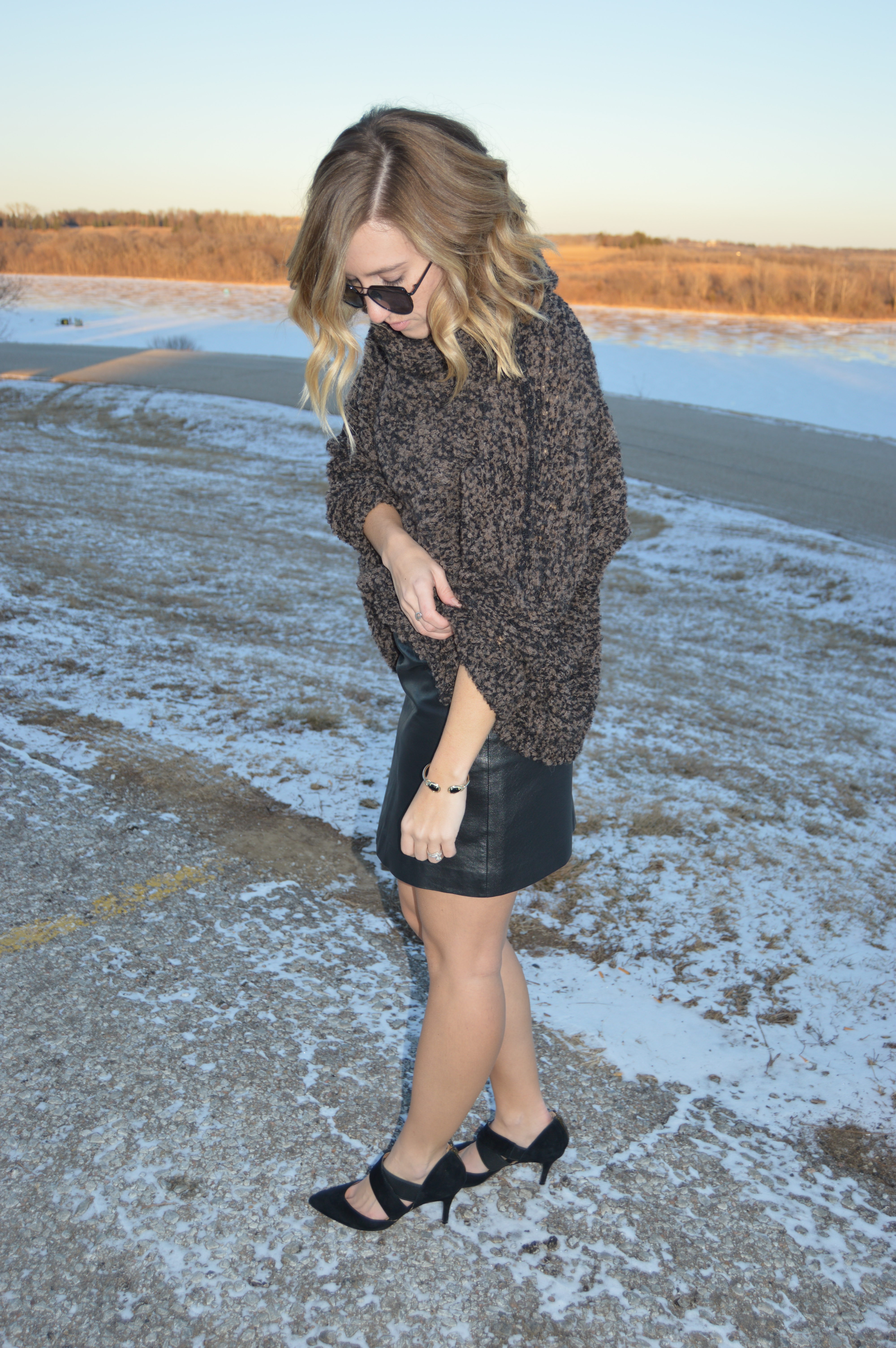 So far this has to be in the Top 3 of favorites this winter. Of course I love OTK boots, cozy cardigans and my trusty dark denim but there is just something about this leather mini paired with what I’ve been calling my ‘teddy bear sweater‘ {which is currently on sale! I’m wearing the XS & it’s still pretty oversized!} and pumps that instantly boosts my mood. And I need allllllll the positive feels this time of year because the Winter blues are a real thing for me. I feel like I’m going against the rules by baring my legs and while I was of course chilly, it was totally worth it. This look is perfect for a girl’s night or dinner date and by adding a pair of opaque tights, could definitely be worn in the office as well. No way was I going to let the fact that there was snow on the ground cramp my style. Do y’all think I’m crazy or would you wear this combo for a chilly night out?!